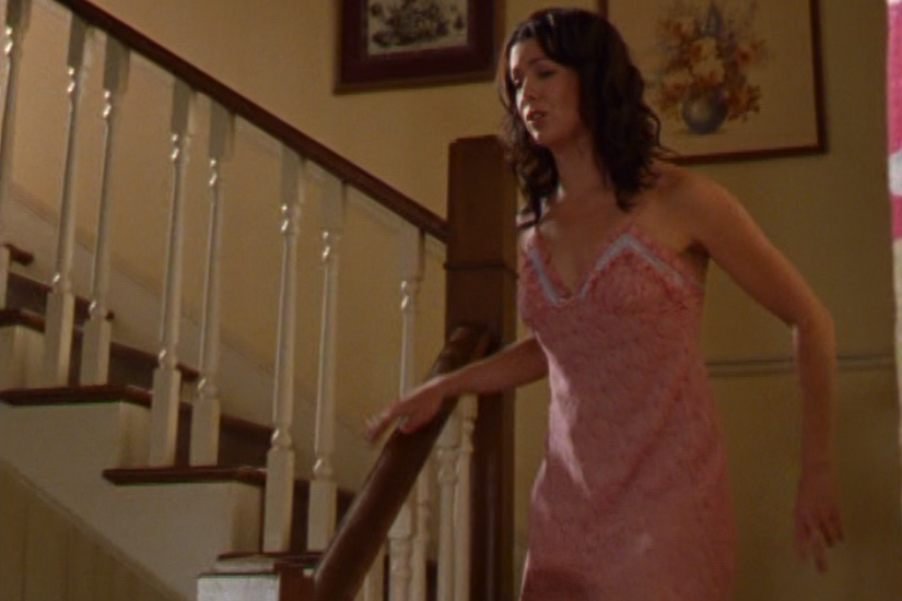 In this same episode, Luke dreams that Lorelai tells him not to get engaged to his girlfriend, Nicole. His dream parallels one that Lorelai had in the season premiere: She imagines she and Luke are married, and she is pregnant with twins. Her outfit should’ve been the tip-off: Dream Lorelai wears a pink negligee, while Real Lorelai favors T-shirts and sweatpants to bed.