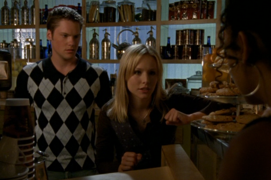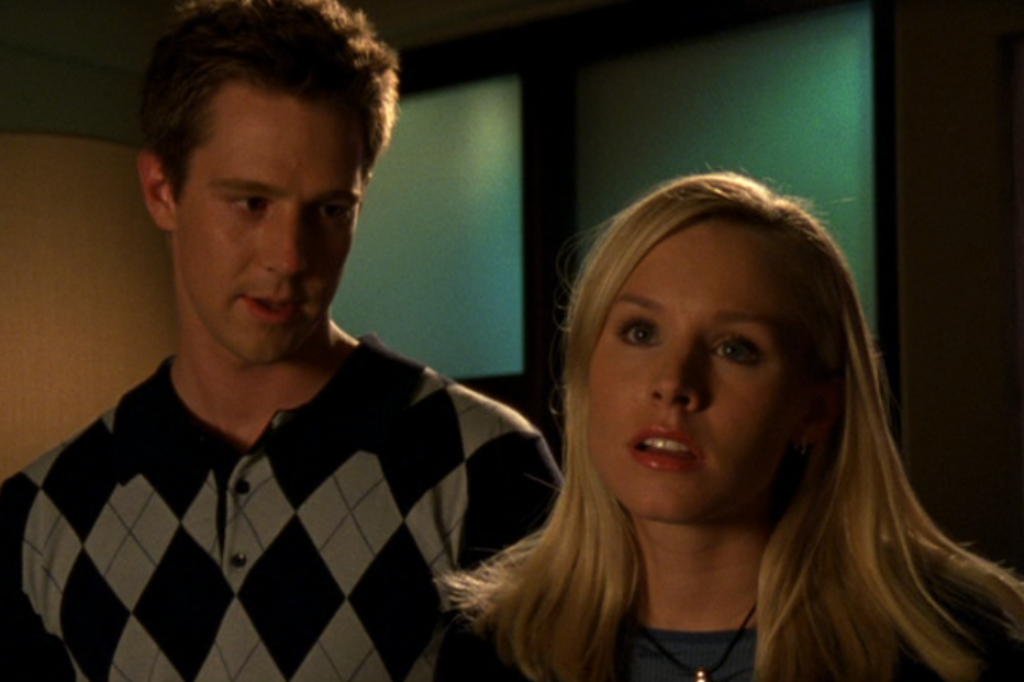 Of course, they’re all the same shirt. According to costume designer Salvador Perez, the show’s creator, Rob Thomas, “thought it would be funny” (MTV News) to move this argyle polo from Duncan to Logan (post–house fire) to Stosh “Piz” Piznarski (post–dorm theft). The passing of the shirt feels like the anointing of a love interest, not unlike the passing of the gray argyle cardigan on Gossip Girl: Before Veronica’s relationship with Duncan ends for good, Logan dons the shirt; before her relationship with Logan hits the rocks, Piz puts it on. The shirt looks odd on Logan—the preppy navy argyle doesn’t fit with his usual browns and oranges, his beachy style—but it’s not so strange on Piz, who often wears blue. Piz’s color palette creates a parallel between him and Duncan; yes, Piz is more indie than Duncan was, but he serves the same tired function—the “good boy” alternative to Logan’s “bad boy.”