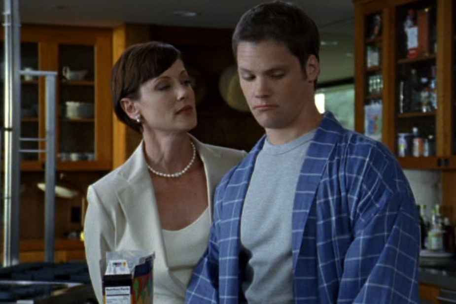 First, Celeste Kane—though let’s be honest, Celeste would never throw her clothes on the floor. As the wife of billionaire Jake Kane, Celeste demonstrates her wealth and taste through her wardrobe: crisp white suits and trench coats, double or triple strands of pearls. She’s almost always in white or another light color—the privilege of not doing your own laundry. Laundry almost becomes a metaphor for Celeste’s relationship with her children, Duncan and Lilly. When Lilly is murdered, Celeste and Jake wash the blood from Duncan’s soccer uniform—and the evidence, they think, of his guilt. When Duncan lives alone in the Neptune Grand hotel, Celeste brings him a basket of fresh clothes—washed and folded, naturally, by an assistant. Celeste is a lot like the Rhodes women on Gossip Girl: she wants her family to maintain a tidy outward appearance, and she’s prepared to clean up any hint of dirtiness.